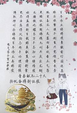 作品介绍:感悟伟大成就,汲取奋进力量。在学习党的二十大重要精神后,我深刻感受到党带领人民踏平山海、逐风挽浪的气魄;深刻认识到党在过去一百年的引领作用,党是各民族人民的利益所系、幸福所系。作为一名党员,身为法学生的我将会更加努力践行法治理念,捍卫法律尊严,蓄人文之底蕴,昌法治之文明,聚焦时代课题,回应时代关切,紧密联系党的百年奋斗征程和当下中国的具体实践,全面学习、全面把握、全面落实党的二十大精神,踔厉奋发,笃行不怠!