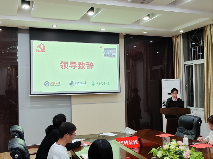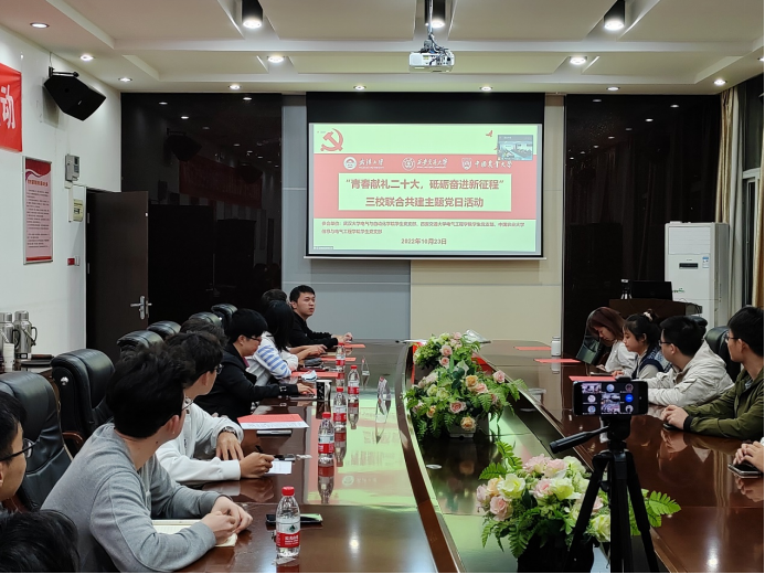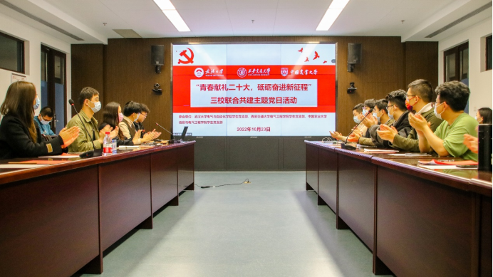 2022年10月22日上午,中国共产党第二十次全国代表大会庄严闭幕。为深入学习贯彻党的二十大精神,10月23日晚7点,玩滚球的十大正规平台研究生党支部联合西安交通大学电气工程学院研究生党支部、中国农业大学信息与电气工程学院研究生党支部通过“线下会场+线上会议”的方式举行“青春献礼二十大,砥砺奋进新征程”三校联合共建主题党日活动,增强校际交流,领会党的二十大精神。外围十大玩球app电气与自动化党委副书记孟威、西安交通大学电气工程学院党委副书记宋杰、玩滚球的十大正规平台组织员彭赟、西安交通大学辅导员柴冠坤、中国农业大学辅导员曹靖婕以及三校部分党支部成员们出席活动,线上和线下共300余人参与,西安交通大学电气工程学院硕2061党支部书记刘成成主持活动。