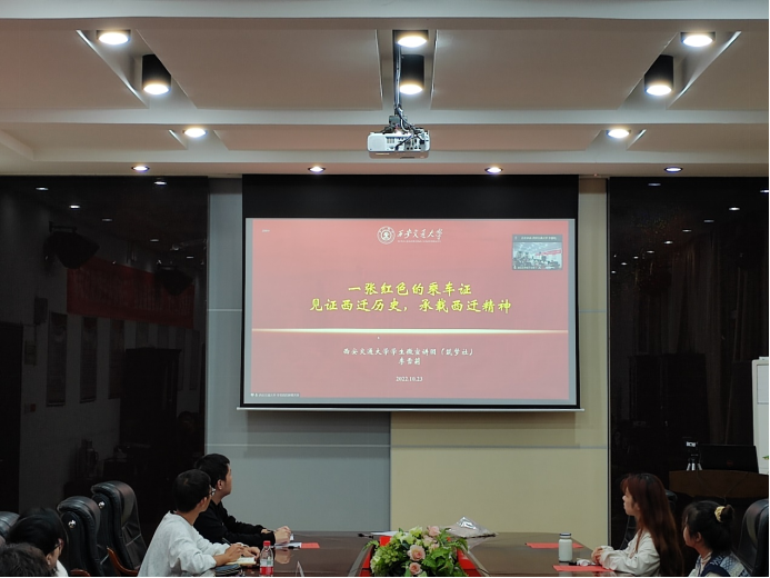 西安交通大学学生微宣讲团副团长李雪莉同学进行了“西迁精神”的主题宣讲。李雪莉用一张西迁专列乘车证引入,讲述西迁历史。20世纪50年代交通大学教职工从上海前往西安,向科学进军,建设大西北。“西迁精神”是第一批被纳入中国共产党人精神谱系的伟大精神,习近平总书记在考察西安交通大学时指出,“西迁精神”的核心是爱国主义,精髓是听党指挥跟党走,与党和国家、与民族和人民同呼吸、共命运,具有深刻现实意义和历史意义。最后,她表示,今天再次分享“西迁精神”,就是要不断提高政治意识,“胸怀大局,无私奉献,弘扬传统,艰苦创业”的“西迁精神”将继续砥砺交大以及其他两所学校的师生奋勇前行,建功立业新时代。