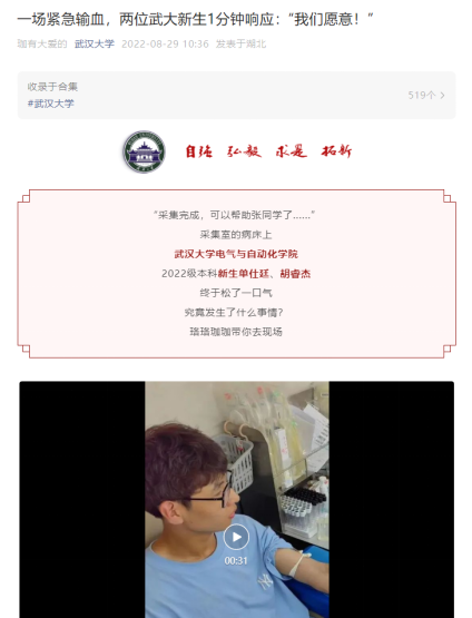 当王青得知新生因肠胃疾病急需定向输血,立即在新生群紧急招募爱心志愿者并第一时间带志愿者奔赴医院为同学救急。这场爱心接力被外围十大玩球app官微、学工部官微、武大招办官微等多家媒体报道转载,把电气的志愿友爱精神传递出来。