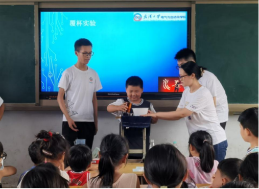 校史课程,以《使命》开篇,逐少年梦,追青云志,《武大故事》,手绘漫画,讲述红色历史,队员们还给每位小学生送上了一张武大明信片;通识课程,覆杯实验、摩擦力实验、立鸡蛋实验、烧杯吸水,四个趣味小实验,带领同学们领略科学之美,感悟实验是检验科学的重要手段;趣味折纸,“无敌穿云”“仿生蝙蝠”“超级回旋”三种趣味纸飞机,展示手工之美的同时,向同学们简单科普空气动力学,用双手放飞理想;音乐课程,展阳光风貌,品丝竹之声。“昆山玉碎凤凰叫,芙蓉泣露香兰笑。”中国传统乐器,不鸣则已,一鸣惊人,小老师依次展示笛、箫、唢呐、二胡,奏天籁之声,回味无穷;趣味体育,队员们带领同学们“双人背夹气球障碍接力赛”,教导同学们团队合作的重要意义,展现团队精神。