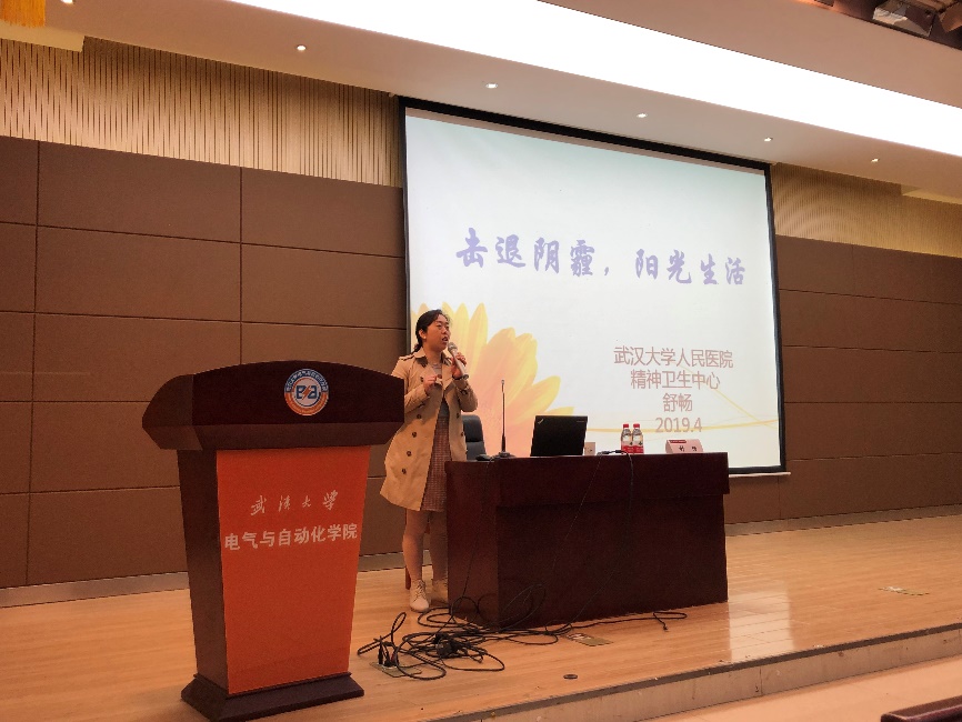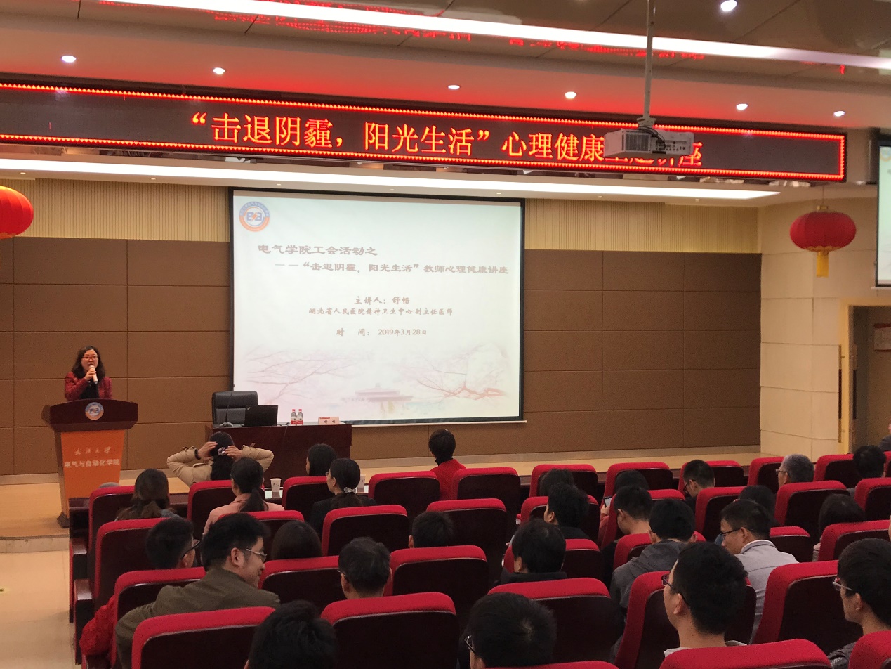 为进一步加强玩滚球官网师生心理健康教育工作,确保玩滚球官网师生都能以健康的心态面对科研和生活,2019年3月28日下午2:30,玩滚球的十大正规平台工会在电气报告厅举办了“击退阴霾,阳光生活”心理健康主题讲座。本次讲座邀请的嘉宾为湖北省人民医院精神科副主任舒畅,学校党委学生工作部副部长仲华,玩滚球官网党委书记余向红及全体教职工、研究生参与了本次讲座。