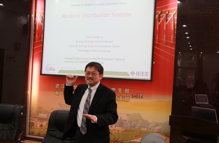 美国华盛顿州立大学电气工程和计算机科学系教授、波音杰出讲座教授、IEEE Fellow刘镇钦(Chen-Ching Liu)教授于2015年12月21至23日来玩滚球官网访问交流。来访期间,刘教授在电气学院院长助理林涛教授的主持下分别做了题为“Resilient Distribution Systems”和“Monitoring of Power System Dynamics through PMUs”的精彩学术报告,重点讲授了刘教授科研团队近期在配电网故障定位、恢复控制、微电网以及基于广域PMU数据的状态观测等领域做出的重要研究成果。刘教授及其团队与玩滚球官网建立了长期合作关系,其本人也多次到玩滚球官网访问交流,为玩滚球官网师生带来最新的研究成果报道,分析国际前沿热点研究动态,对玩滚球官网师生的研究工作提出独到的意见和建议,积极帮助玩滚球官网提升国际化的研究视野和水平。