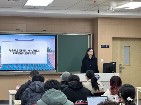 颁奖会上,与会人员就电气行业及未来职业发展规划开展了交流。中能聪聪商务总监胡明皓讲述了自己的职业发展历程。从复旦大学新闻传播学院毕业后,她转行到金融投行,如今又转至发展火热的新能源,成为北京中能科技有限公司的商务总监,她分享了自己的职业选择观点,给同学们提供了一个精彩的职业规划案例。