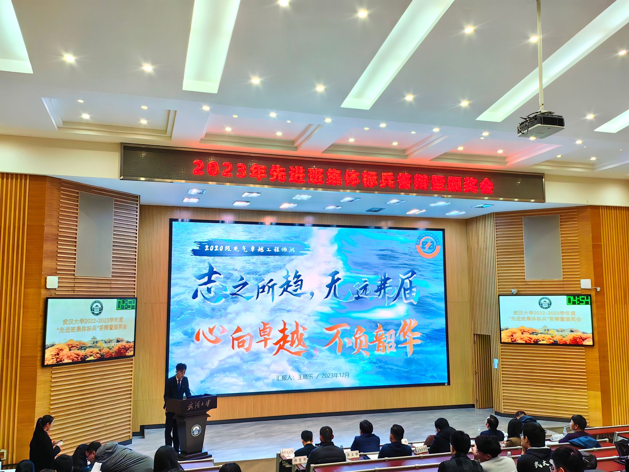 20级卓越工程师班班长王晓乐代表班级进行答辩汇报。王晓乐同学简要介绍班级组织架构、学生学习科研情况以及课外文体活动,并从思想引领、学风建设、活动开展和未来展望等4个方面详细汇报班级情况。通过展示,王晓乐同学表达了20级卓越工程师班追求卓越的决心,将继续团结带领班级同学踔厉奋发,笃行不怠,努力为“武大电气,中国电力”的使命贡献青春力量!