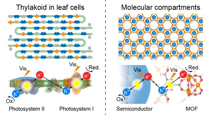 每分钟辐照到地球表面的太阳能相当于4亿吨煤燃烧所产生的能量,因此发展高效的太阳能利用策略,不仅可丰富现有能源结构,还可降低大气中CO2的排放。目前植物的太阳能利用效率高于一般人工光合体系,这得益于植物细胞经过亿万年自我进化,形成功能精准分区的“分子隔间”,通过“分子隔间”的协同作用,将照射到植物表面的光子高效转化为电子,最终产生葡萄糖和氧气。