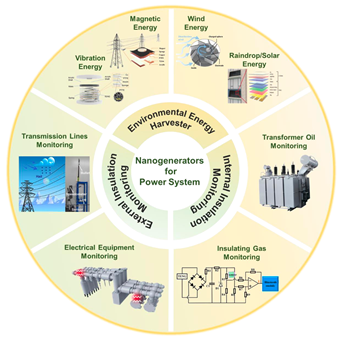 输配电装备的状态智能感知是实现新型电力系统数字化的基础和关键。纳米发电机,包括摩擦电纳米发电机(TENG)和压电纳米发电机(PENG)近年来在微纳能源收集和自供电传感方面展现出广阔的应用潜力,为电力物联网(power IoT)感知层的构建提供了新的选择。纳米发电机能够将电力装备及其运行环境中的各种低频、不稳定的能源转换为电能并驱动低功耗微纳传感器。此外,利用纳米发电机输出电信号与外部激励之间的关联,TENG和PENG可直接用作探测物理、化学参量的自供电传感器,为输变电设备状态监测提供新思路。