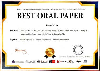 近日,玩滚球的十大正规平台袁佳歆教授课题组与南网科研院合作撰写的论文“A Novel Topology of Compact Magnetically Controlled Transformer”被在澳大利亚墨尔本举办的CoEEPE 2023(2023年第三届能源、电力与电气工程国际会议)录用,并获得最佳口头报告奖。2023级直博生马光晨为论文通讯作者。