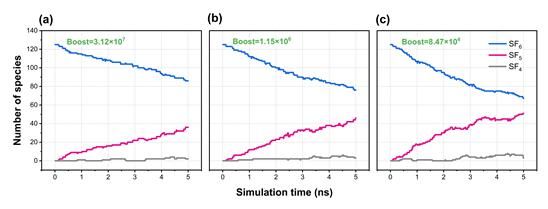 针对上述难题,该文为SF6故障反应体系“量身定制”了一套基于硫-氟键长的集合变量驱动的超动力学方法加速策略,基于优化ReaxFF反应力场对SF6分子热解过程进行了长达5纳秒的反应分子动力学模拟,模拟对应的物理时间尺度扩展了8.47×104倍。论文首次在低至1600K的模拟温度下获取SF6气体热解过程的分子动力学数据,基于相同温度范围的实验结果对模拟结果进行验证,结果显示在实际温度范围(1600~2000K)目标反应的动力学数据与实验高度一致。基于准确的动力学轨迹,论文比较了与大幅升温的传统MD模拟下SF6分解机理的差异。该成果为下一步揭示SF6跨时空故障分解机理、构建SF6高效催化转化体系等提供了理论支撑。