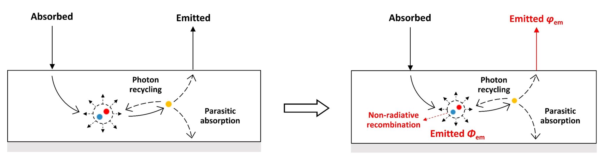 图1 传统光子回收模型示意图(左)和新型光子回收理论模型(右)