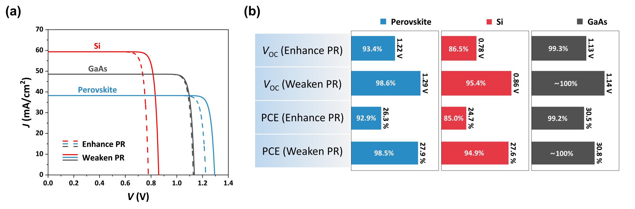 图2 增强和削弱光子循环情况下的太阳能电池性能对比 :(a) 电流密度-电压(J-V)曲线,(b) 太阳能电池的开路电压(VOC)和光电转化效率(PCE)