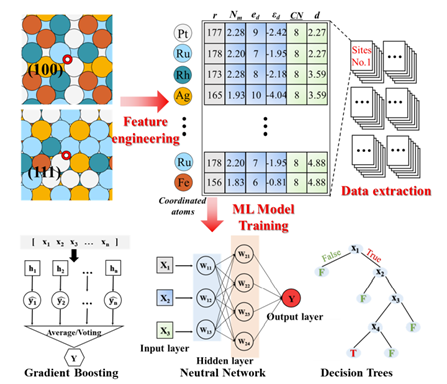 先进的能量存储与转换技术是实现国家双碳战略目标,降低碳排放的关键。氧还原反应(ORR)则是可再生能源转化和利用过程中的一个重要反应。氧气可通过四电子途径还原为水,是质子交换膜燃料电池(PEMFCs)和金属-空气电池中的重要反应。因此探索具有高活性低过电势特性的电极材料以最大限度提高化学能量转换效率迫在眉睫。受益于巨大的构型空间,高熵合金(HEAs)在多相催化剂领域显示出巨大潜力。然而,巨大的结构空间使得通过传统的试错-实验方法系统性研究HEA变得极为困难。因此,课题组提出了机器学习辅助设计的第一性原理计算理论方法,研究了六种五元HEA表面上共计数百万个反应位点的氧还原反应活性。通过合理的数据提取和特征工程,构建了性能良好、精度高、通用性强、简单易用的梯度提升回归模型,可以准确预测HEA表面数百万个反应位点的催化活性。