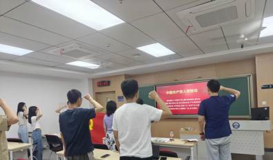 随后,全体与会人员在领誓人邹春航老师的带领下重温了入党誓词。“我志愿加入中国共产党,拥护党的纲领,遵守党的章程,履行党员义务……”声声入耳,右拳紧握,重温入党誓词,是激励毕业生党员们走出校园仍要时刻铭记党员义务,要坚定理想信念,始终保持对党的忠诚和对人民的热爱,勇于担当,敢于作为,以实际行动践行共产党员的初心和使命,用实际行动回应“请党放心,强国有我”的誓言。