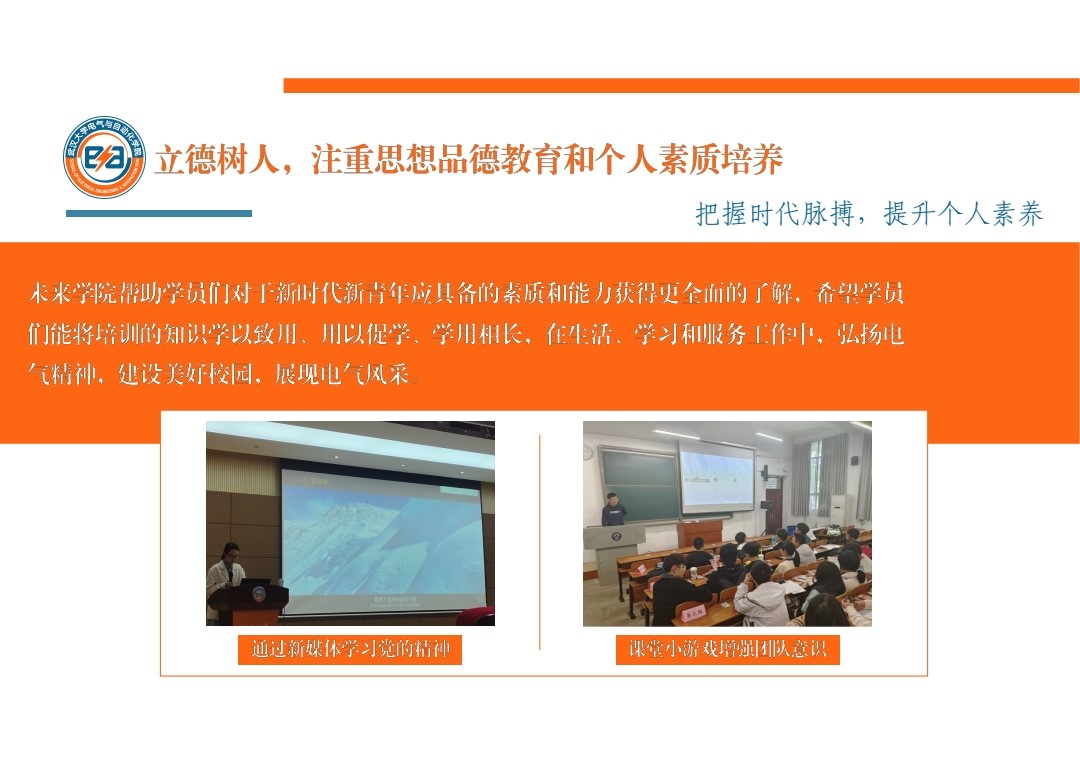 未来学院定期开办课程,落脚于学生干部基本素养需求,锻炼提升电气青年表达能力、实践能力,课程中包揽了“演讲与口才”“公众号运营与排版”等实用内容,课堂上创新教学方式提高教学质量,增强了电气青年的个人能力,培养了更多的接力人。